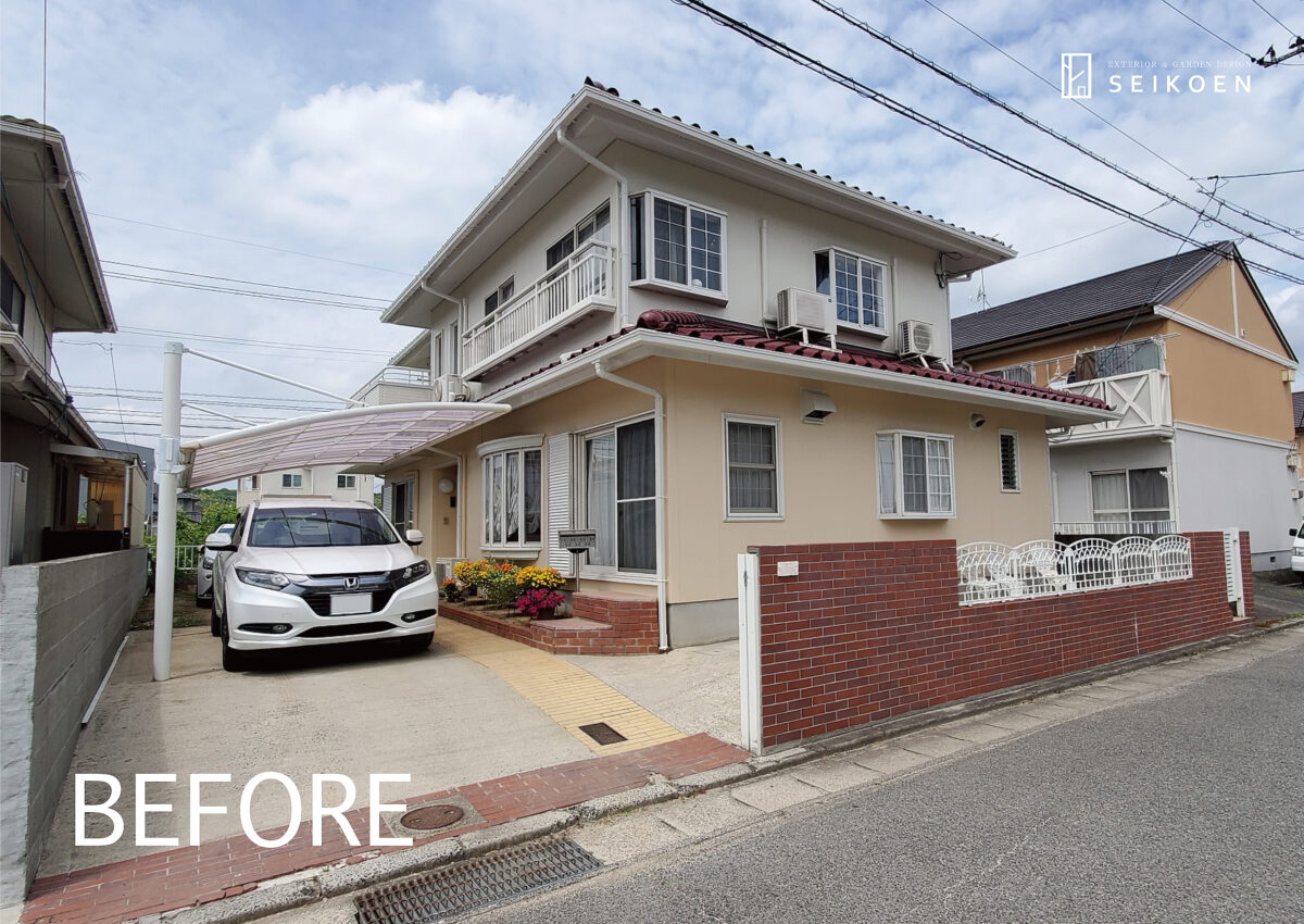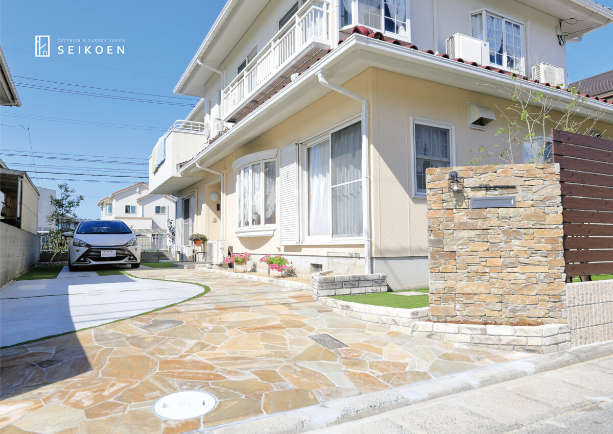 乱張り石を使ってデザインを一新。門壁には石彫を使用。