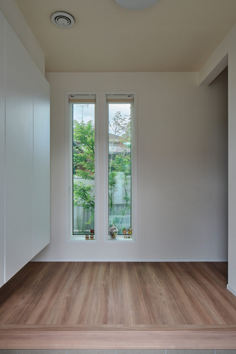 玄関を入ると、縦長の窓からモミジの緑がのぞく、心安らぐ空間。