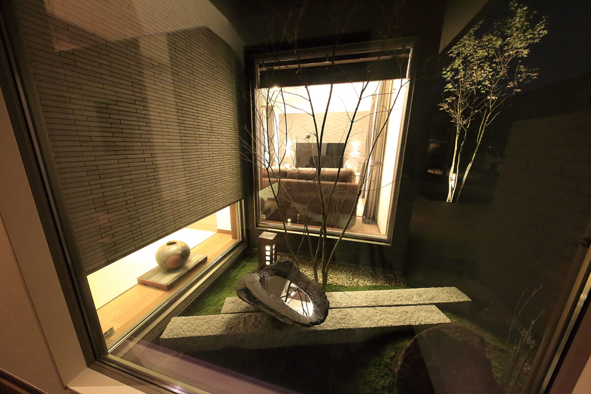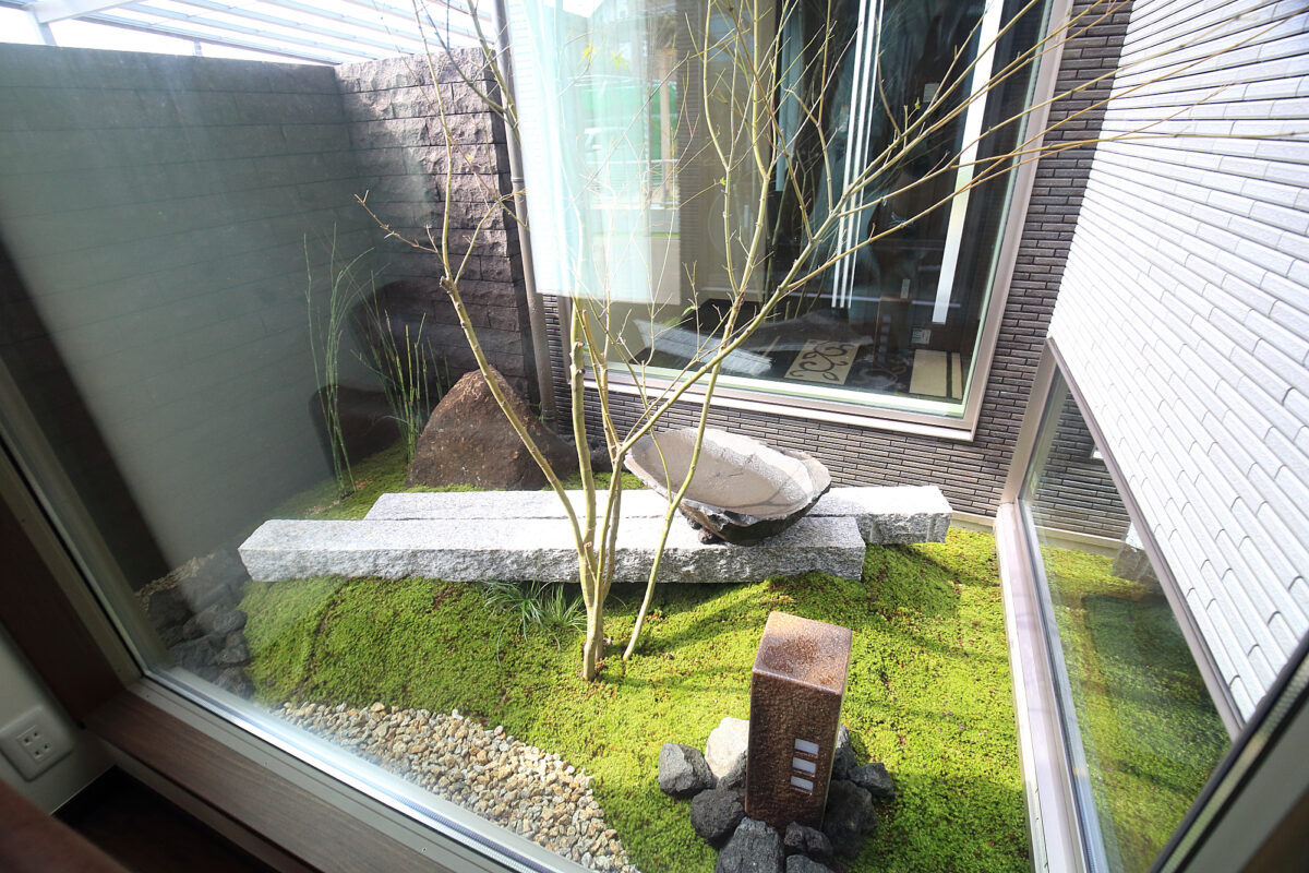 坪庭は、玄関、リビング、そして和室の三方向から眺められるように設計された坪庭です。
