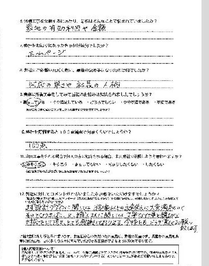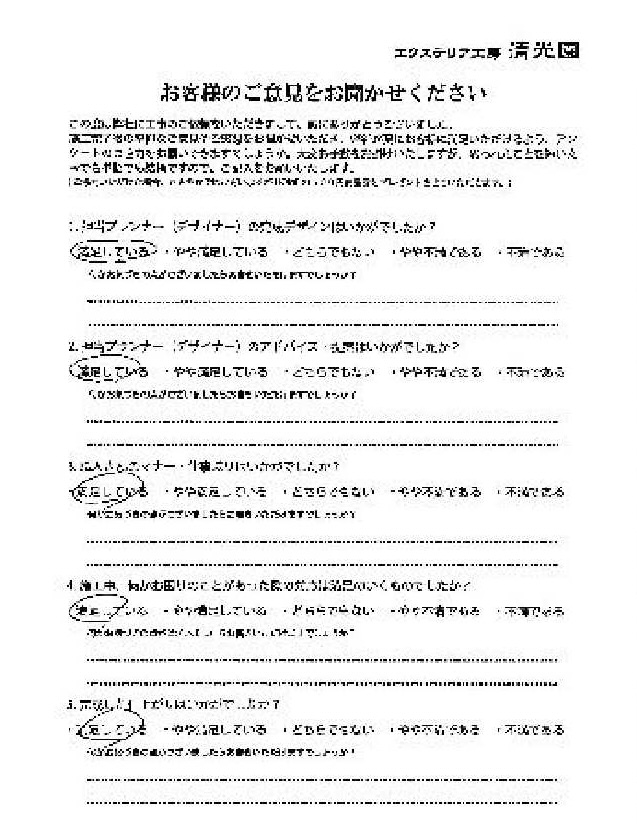 清光園では、工事完了後にお客様へ満足度調査アンケートを実施しております。 お客様からいただく「親切・丁寧」という信頼に真摯にお応えするため、この貴重なご意見を真摯に受け止め、さらなる施工品質とサービスの向上を常に目指してまいります。