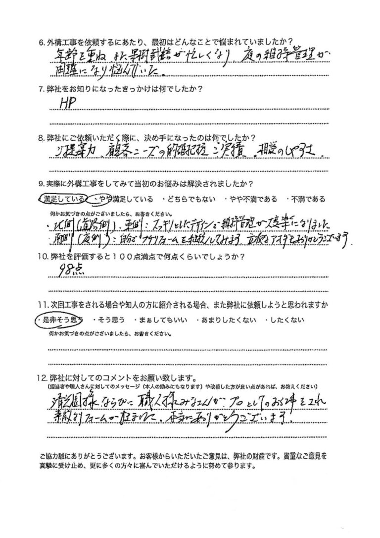 清光園では、工事完了後にお客様へ満足度調査アンケートを実施しております。 お客様からいただく「親切・丁寧」という信頼にお応えするため、この貴重なご意見を真摯に受け止め、さらなる施工品質とサービスの向上を目指してまいります。