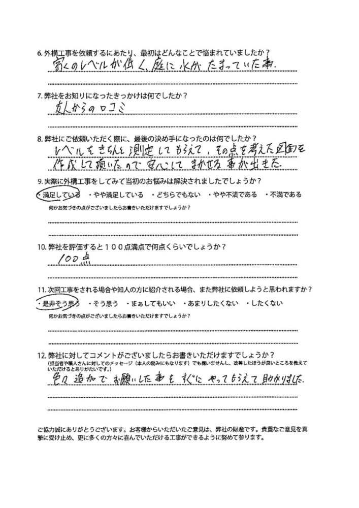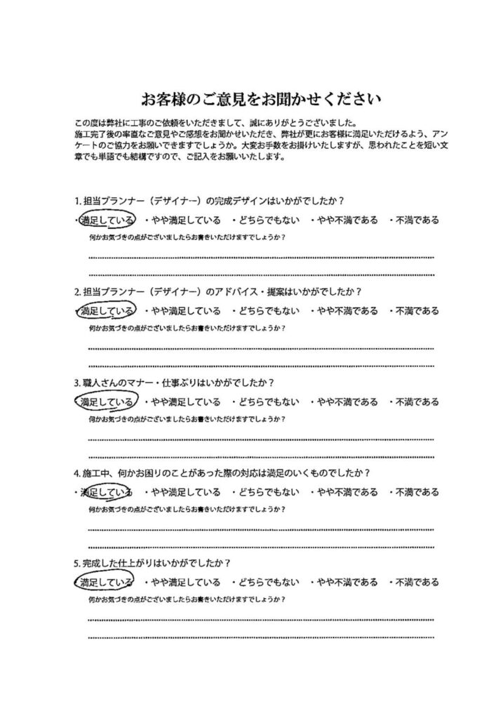 レベルをきちんと測定してもらえて、その点を考えた図面を作成して頂いたので安心してまかせる事が出きた。色々追加でお願いした事をすぐにやってもらえて助かりました。