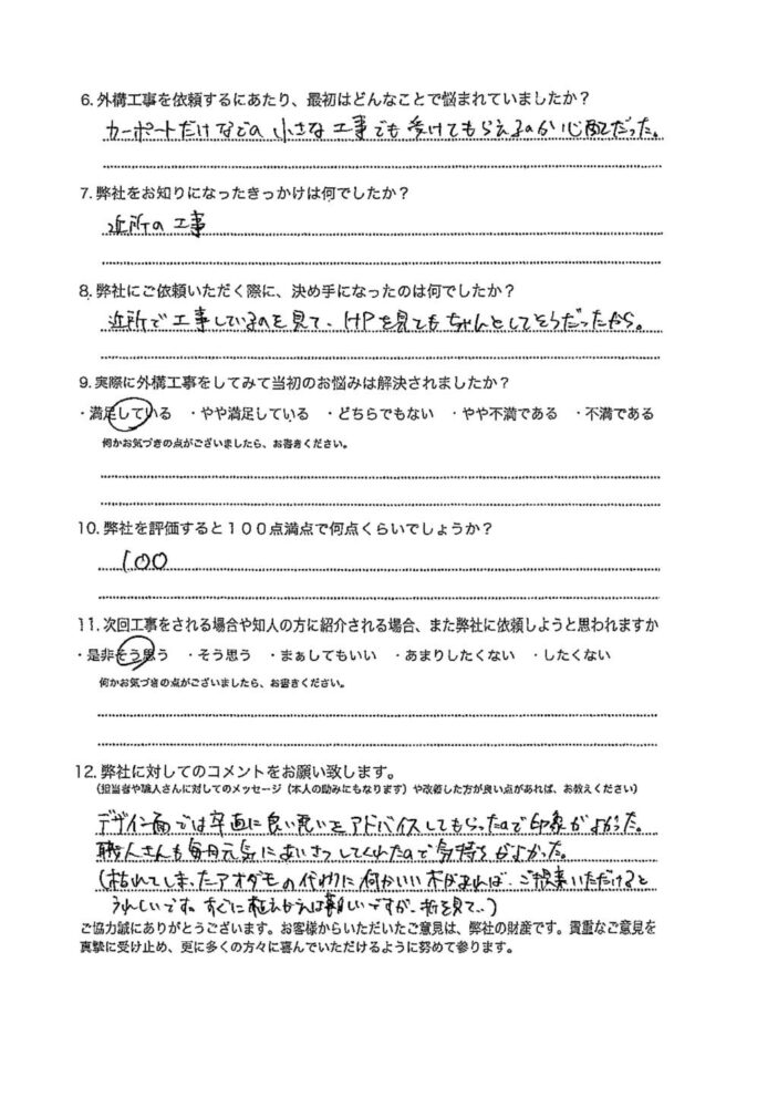 デザイン面では率直に良い悪いをアドバイスしてもらったので印象がよかった。職人さんも毎日元気にあいさつしてくれたので気持ちがよかった。(枯れてしまったアオダモの代わりに何かいい木があれば、ご提案いただけるとうれしいです。すぐに植えかえは難しいですが、折を見て…)