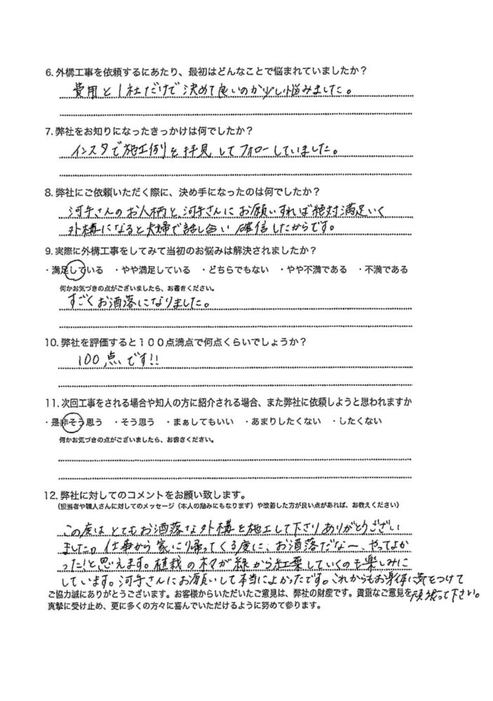 この度はとてもお洒落な外構を施工して下さりありがとうございました。仕事から家に帰ってくる度に、お洒落だな~、やってよかった!と思えます。植栽の木々が緑から紅葉していくのも楽しみにしています。河手さんにお願いして本当によかったです。これからもお身体に気をつけて頑張って下さい。