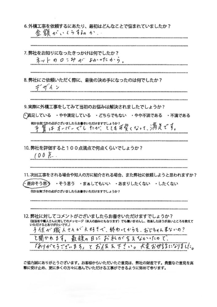 子供が職人さんが大好きで、終わってからも、おじちゃん来ないの?と聞かれます。最後の日にお礼が言えなかったので、「ありがとうございます。」とお伝え下さい。大変お世話になりました。