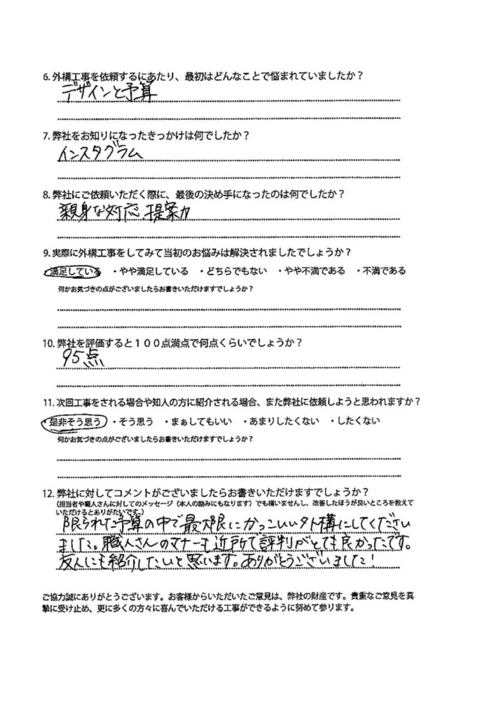 限られた予算の中で最大限にかっこいい外構にしてくださいました。職人さんのマナーも近所で評判がとても良かったです。友人にも紹介したいと思います。ありがとうございました!