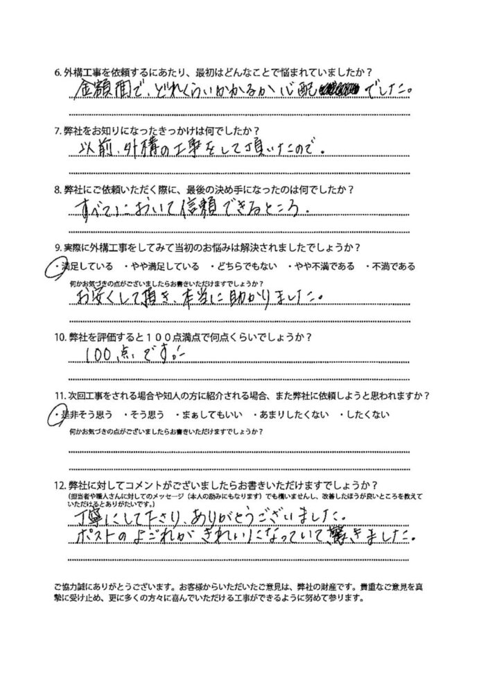 金額面で、どれくらいかかるか心配でした。丁寧にして下さり、ありがとうございました。ポストのよごれがきれいになって驚きました。