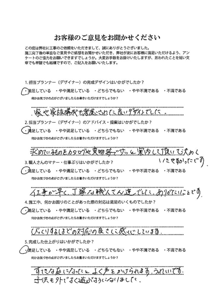 暑い中、短い期間で丁寧に仕上げて頂き(畑や排水溝もおまけで作っていただいてありがとうございます!)本当にありがとうございました。上手に目隠ししながらのびのびと過ごせる庭となりました。