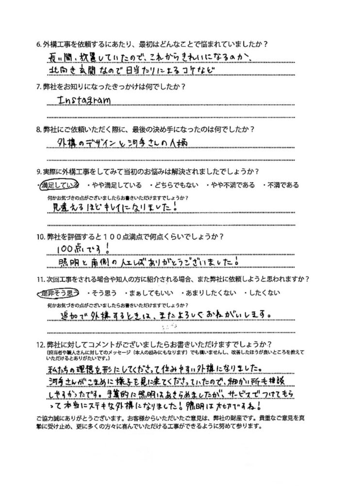 私たちの理想を形にしてくださって住みやすい外構になりました。河手さんがこまめに様子を見に来てくださっていたので、細かい所も相談しやすかったです。予算的に照明はあきらめましたが、サービスでつけてもらって本当にステキな外構になりました!照明は大切ですね!