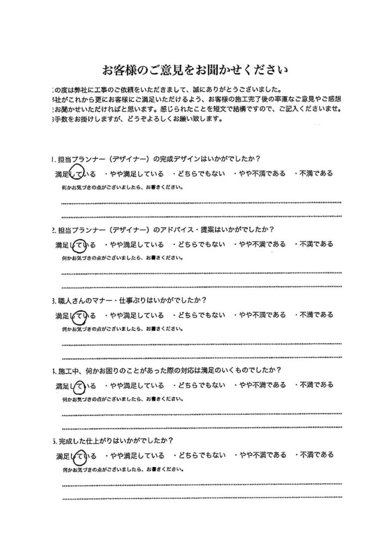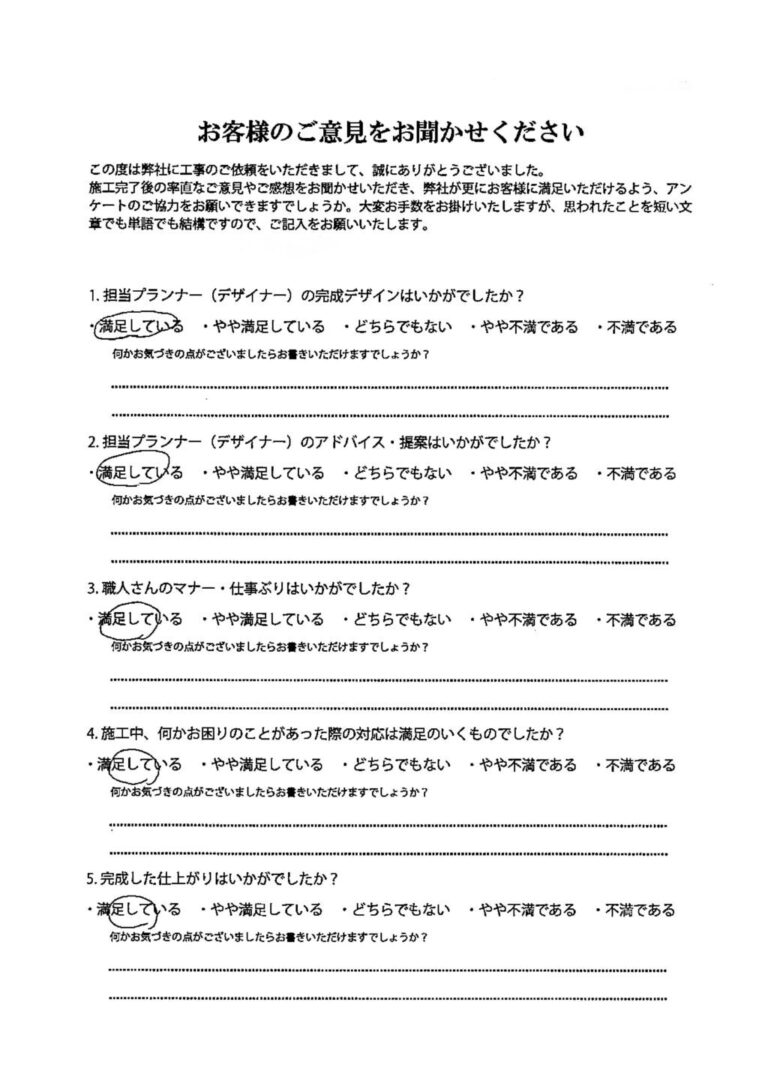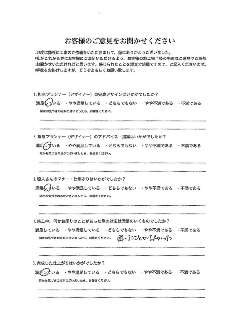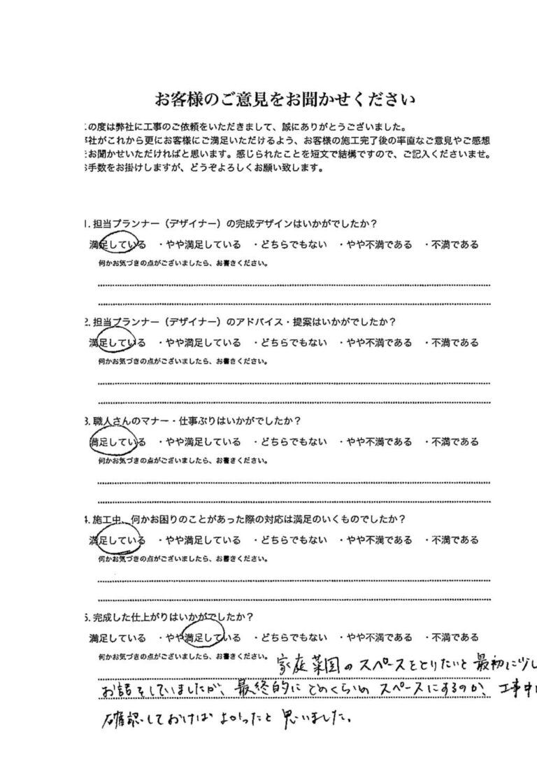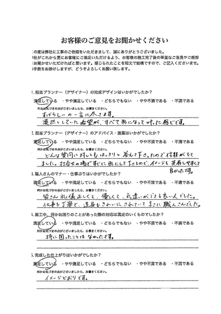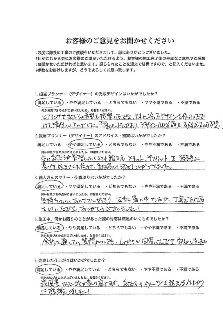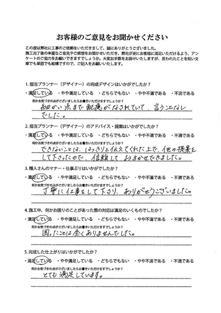 デザインから工事まで、本当にお世話になりました。「これが、プロなのか。すごいな。」と驚く場面がたくさんありました。出来上がりも本当に満足しています。また機会がありましたらよろしくお願い致します。