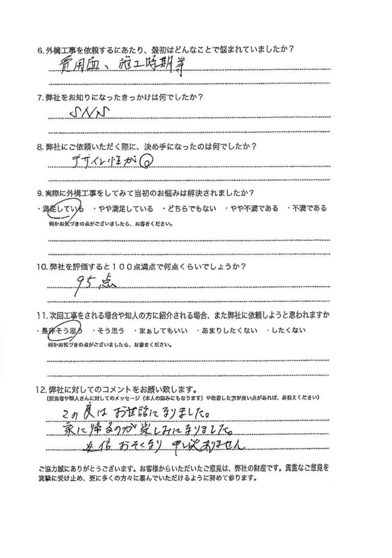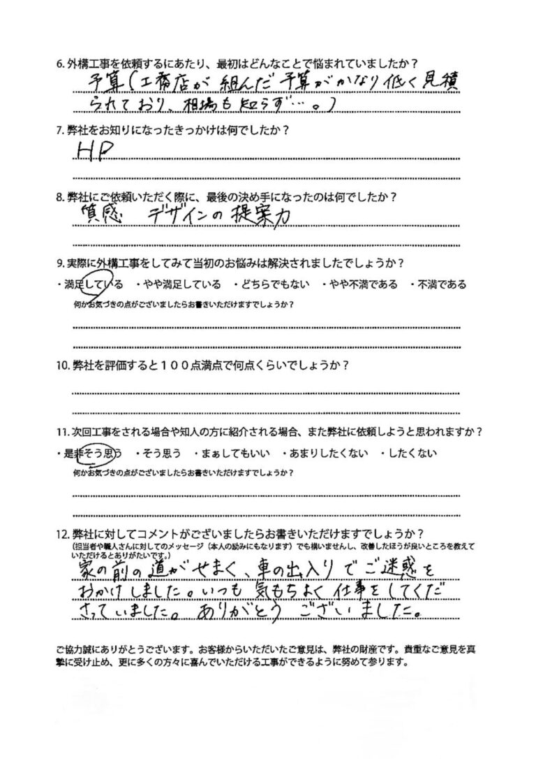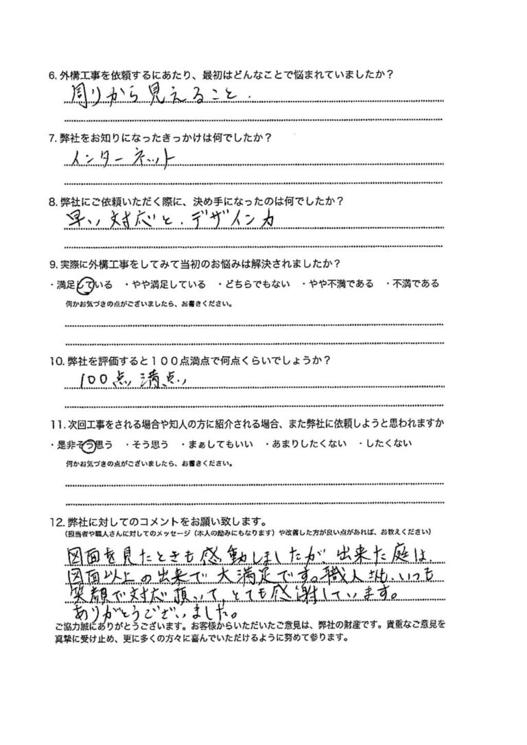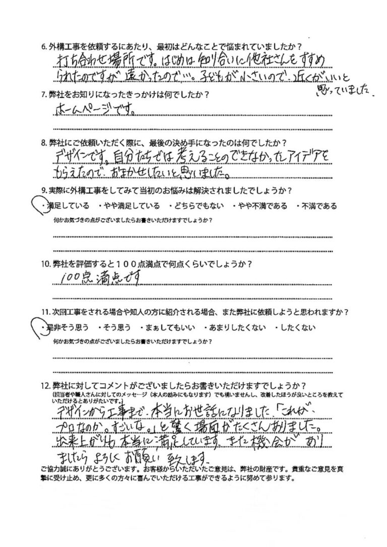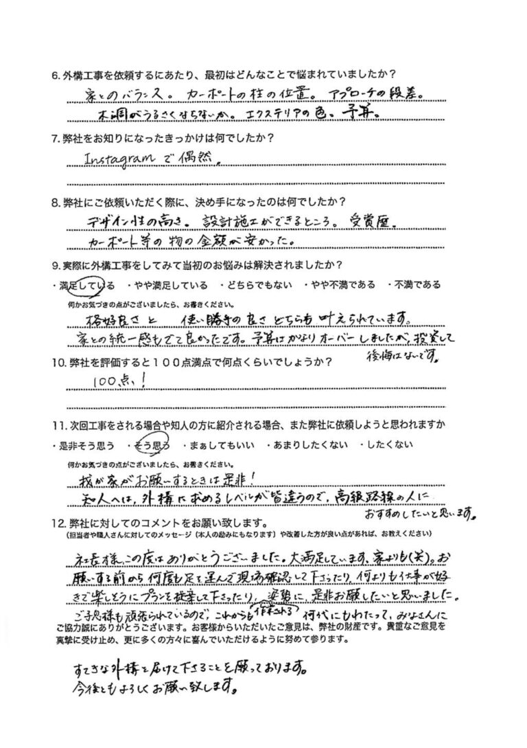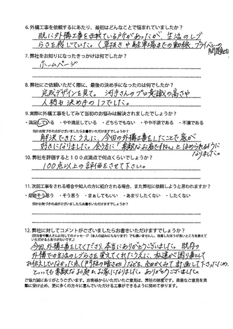 今回、外構工事をしてくださり、本当にありがとうございました。既存の外構での生活のしづらさを変えてくれたうえに、私達が困り事としてお伝えしていなかった点(門柱の暗さetc.)などを、細かくみて計画して下さったため、とっって […]