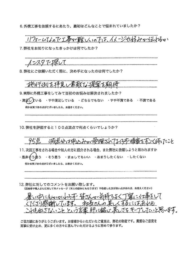 暑い中にもかかわらず皆さん気持ちよく丁寧に仕事をしてくださり感謝しています。社長さんの美しくするにはあれもこれも出さないことという言葉肝に銘じ美しさをキープしたいと思います。