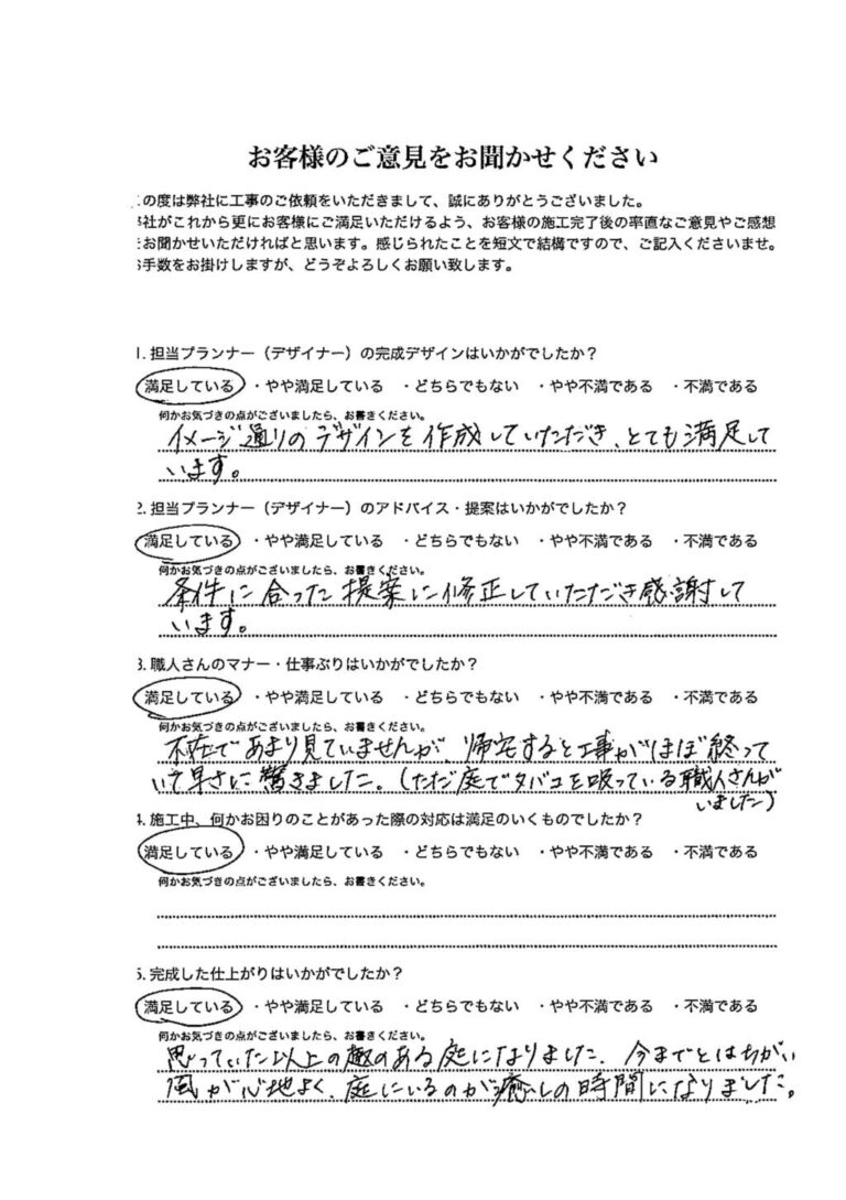 図面を見たときも感動しましたが、出来た庭は、図面以上の出来で大満足です。職人さんも、いつも笑顔で対応頂いて、とても感謝しています。ありがとうございました。