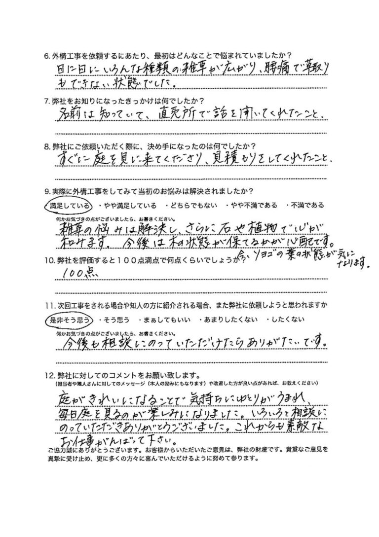 庭がきれいになることで気持ちにゆとりがうまれ、毎日庭を見るのが楽しみになりました。いろいろと相談にのっていただきありがとうございました。これからも素敵なお仕事がんばって下さい。