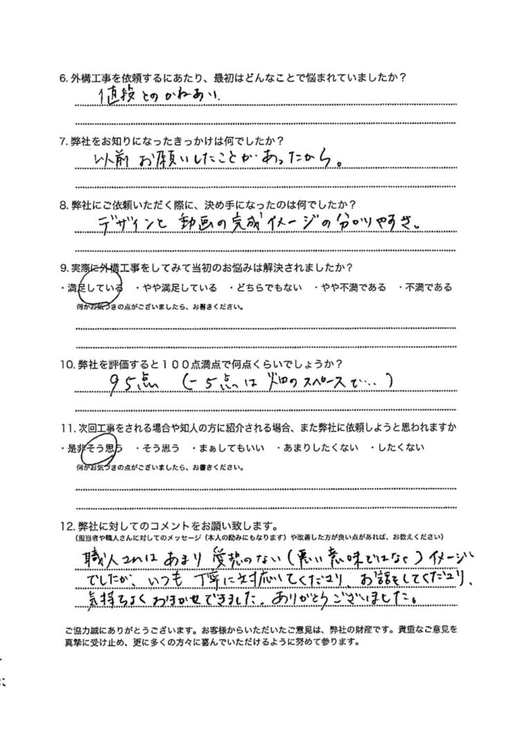 清光園では、工事完了後にお客様へ満足度調査アンケートを実施しております。 お客様からいただく「親切・丁寧」という信頼にお応えするため、この貴重なご意見を真摯に受け止め、さらなる施工品質とサービスの向上を目指してまいります。