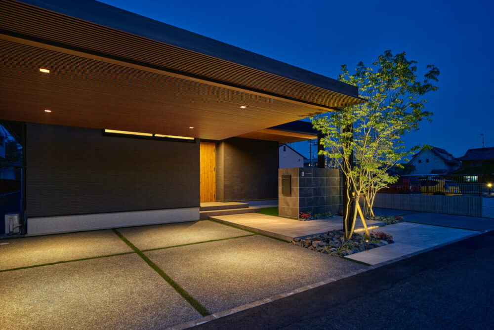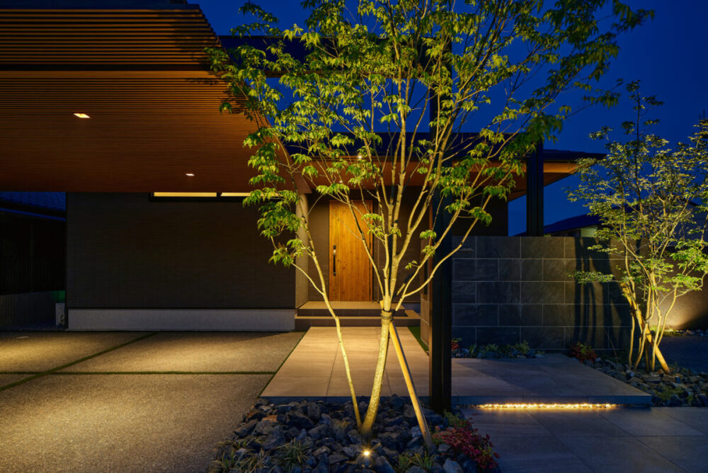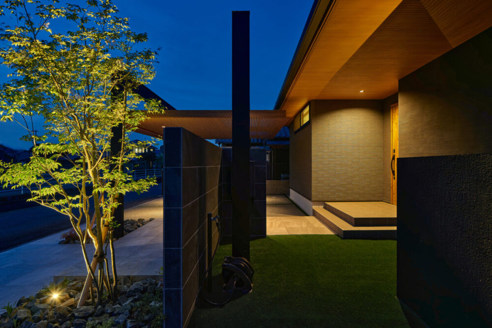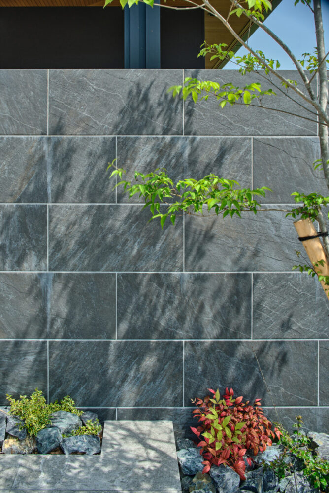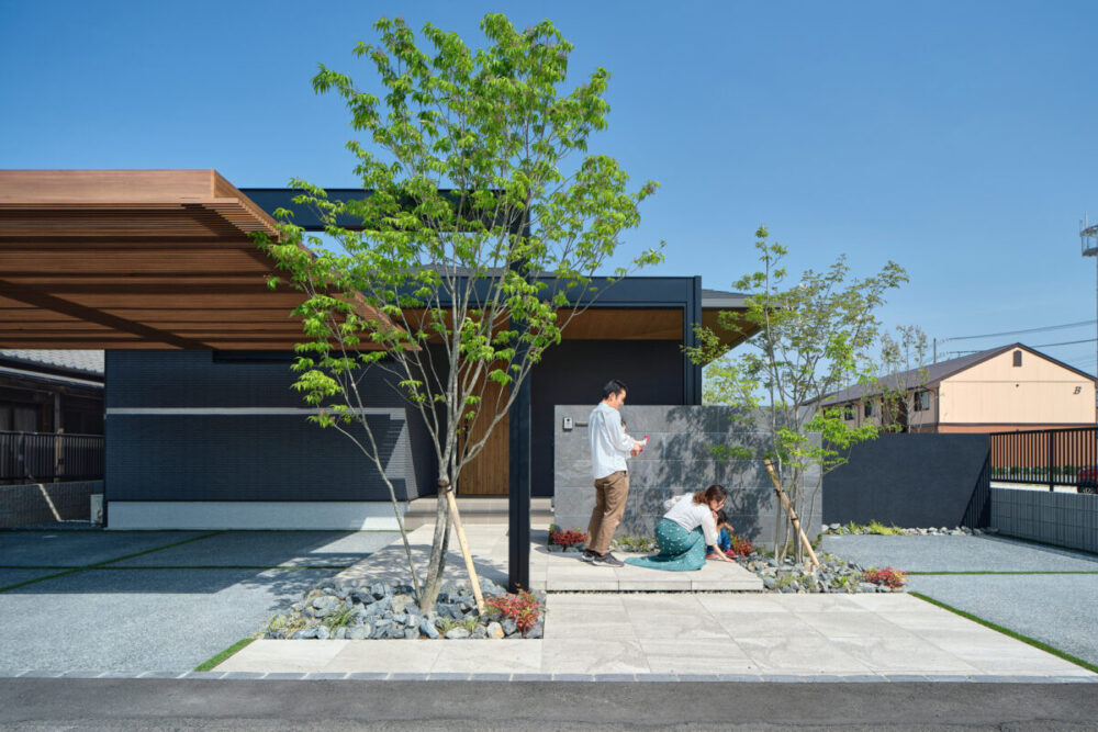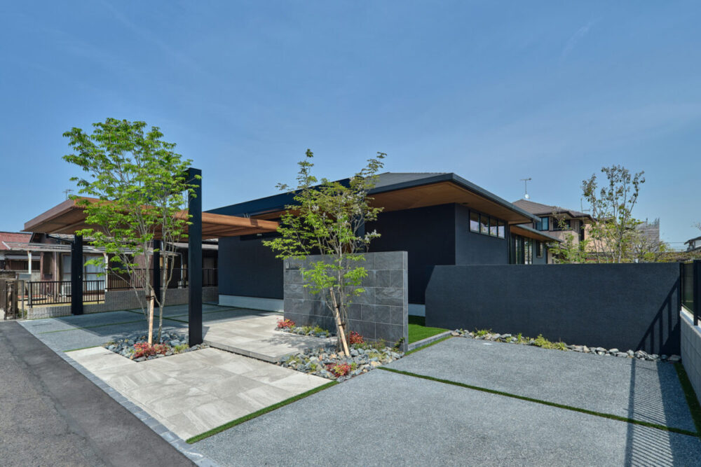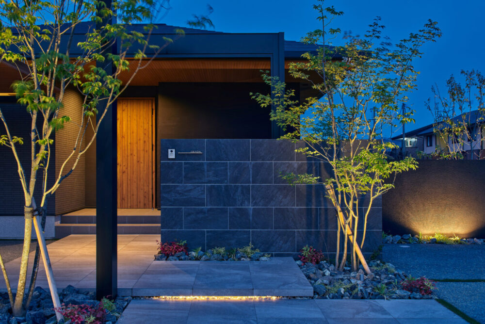 建物の重厚感と深みに合わせ、ブラックを基調とした外壁に、タイルと塗り壁を組み合わせデザインいたしました。設計の際、玄関を開けると通行人や散歩中の方から室内が見えてしまう状況だったため、植栽を活用して視線を遮り、フレームを利用して空間を有効に使いガレージを広く確保。お庭で遊ぶお子様が直接道路に出ないよう、そしてプライバシーを守る目的でタイル門壁を設けています。お庭側の壁は外壁と調和するよう塗り壁で仕上げ、質感の違いによって門壁を際立たせました。大型の宅配ポストはL字に設置し、正面から目隠し。動線も意識した配置としています。植栽により黒を基調とした空間に柔らかさと季節感をプラス。建物全体が美しく引き立つ、暮らしに寄り添うお庭となりました。
