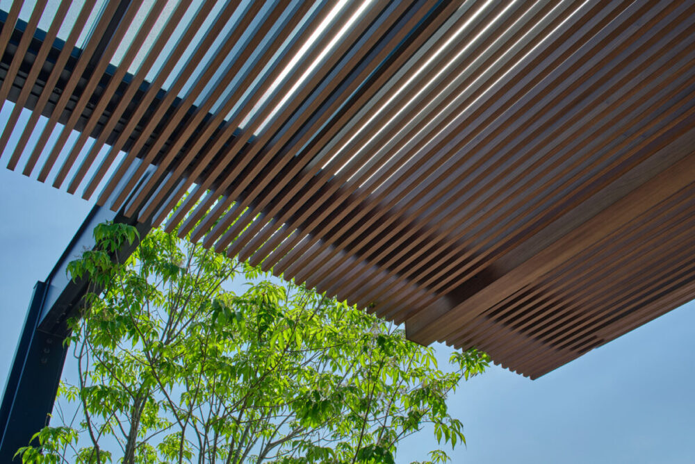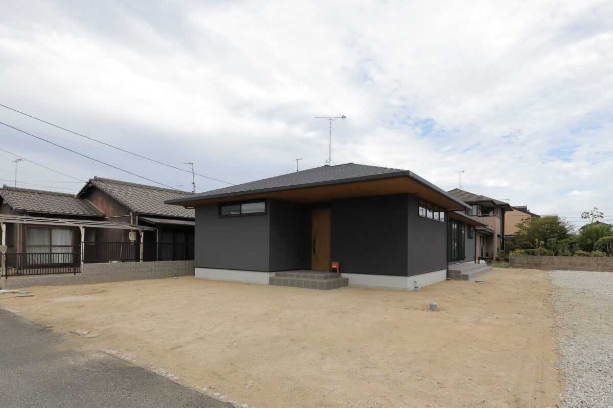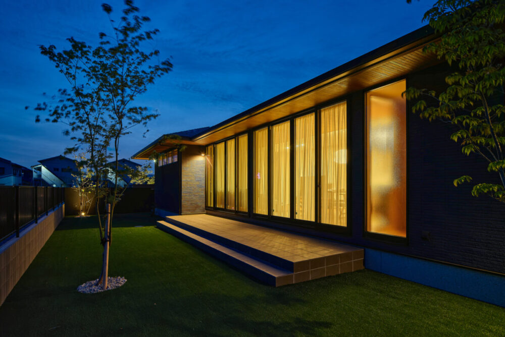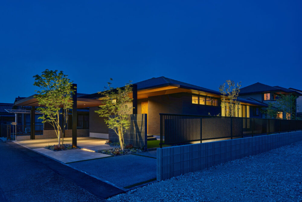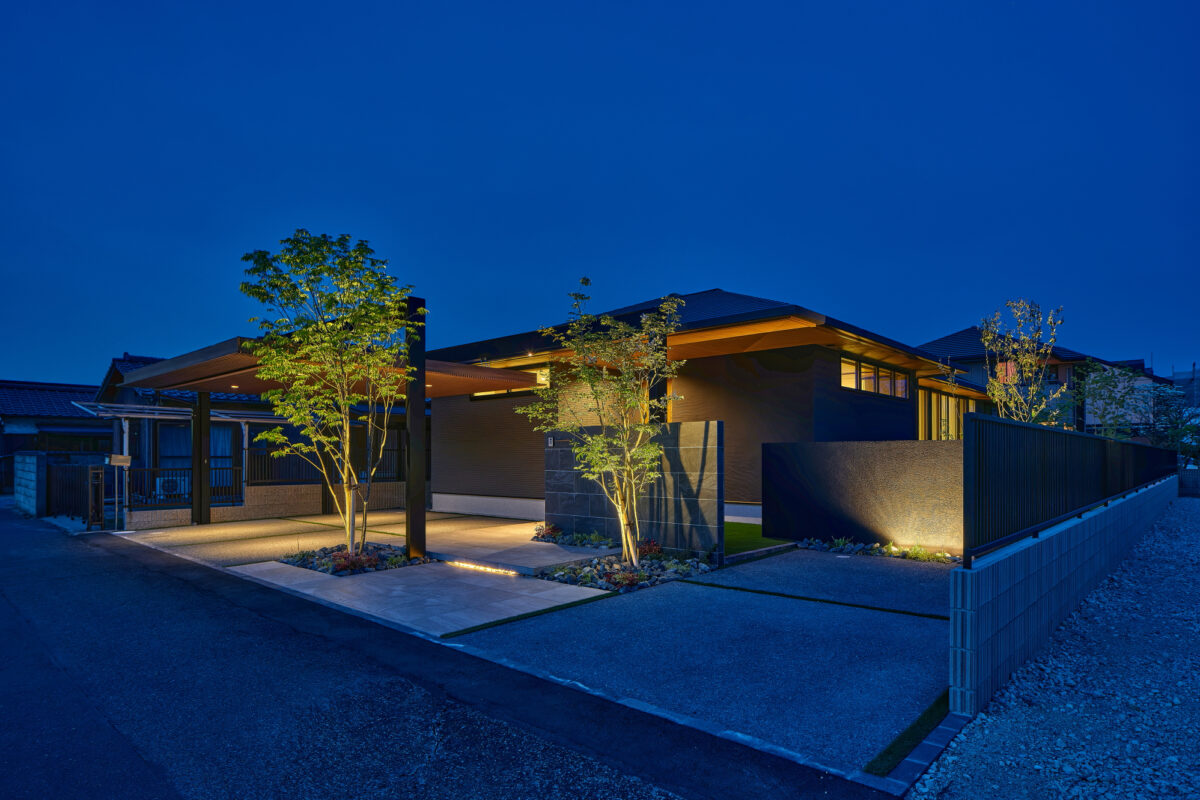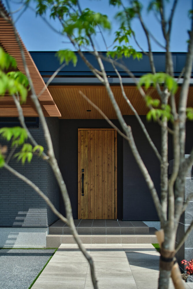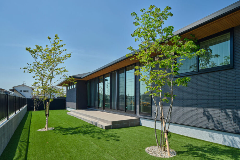 建物の重厚感と深みに合わせ、ブラックを基調とした外壁に、タイルと塗り壁を組み合わせデザインいたしました。設計の際、玄関を開けると通行人や散歩中の方から室内が見えてしまう状況だったため、植栽を活用して視線を遮り、フレームを利用して空間を有効に使いガレージを広く確保。お庭で遊ぶお子様が直接道路に出ないよう、そしてプライバシーを守る目的でタイル門壁を設けています。お庭側の壁は外壁と調和するよう塗り壁で仕上げ、質感の違いによって門壁を際立たせました。大型の宅配ポストはL字に設置し、正面から目隠し。動線も意識した配置としています。植栽により黒を基調とした空間に柔らかさと季節感をプラス。建物全体が美しく引き立つ、暮らしに寄り添うお庭となりました。