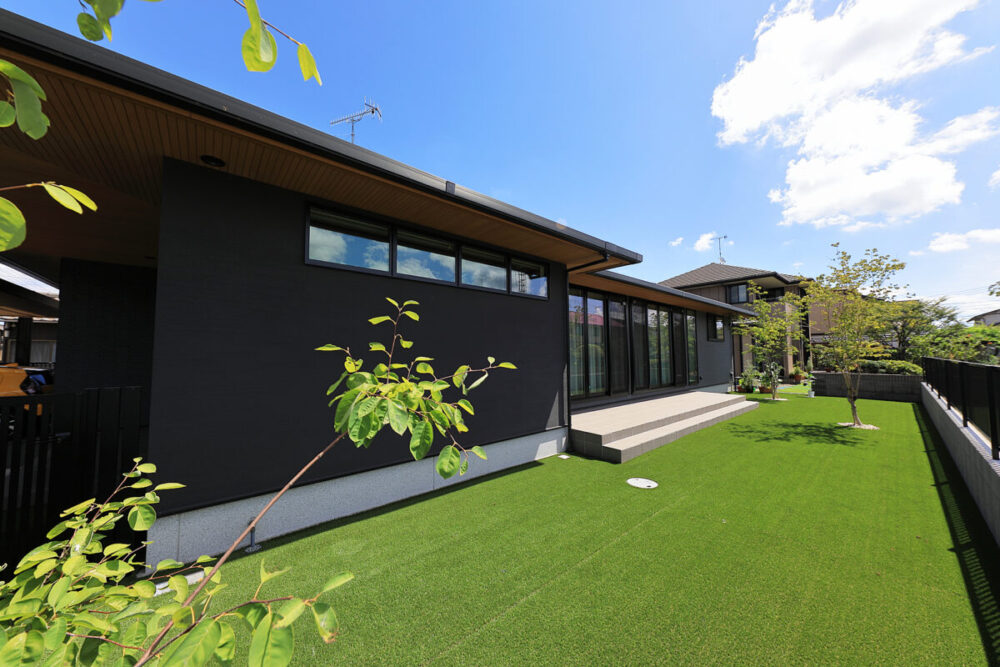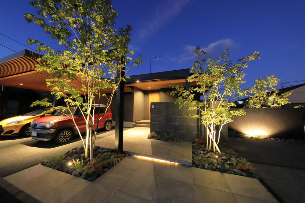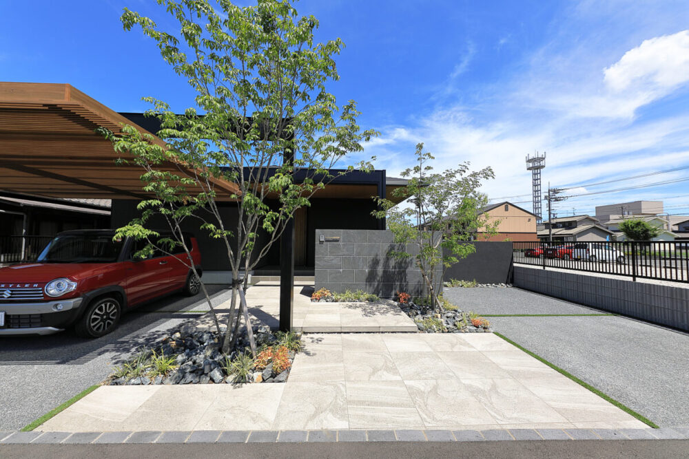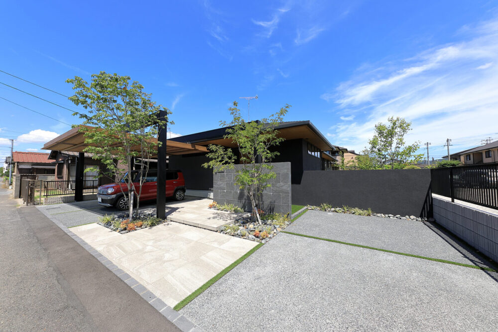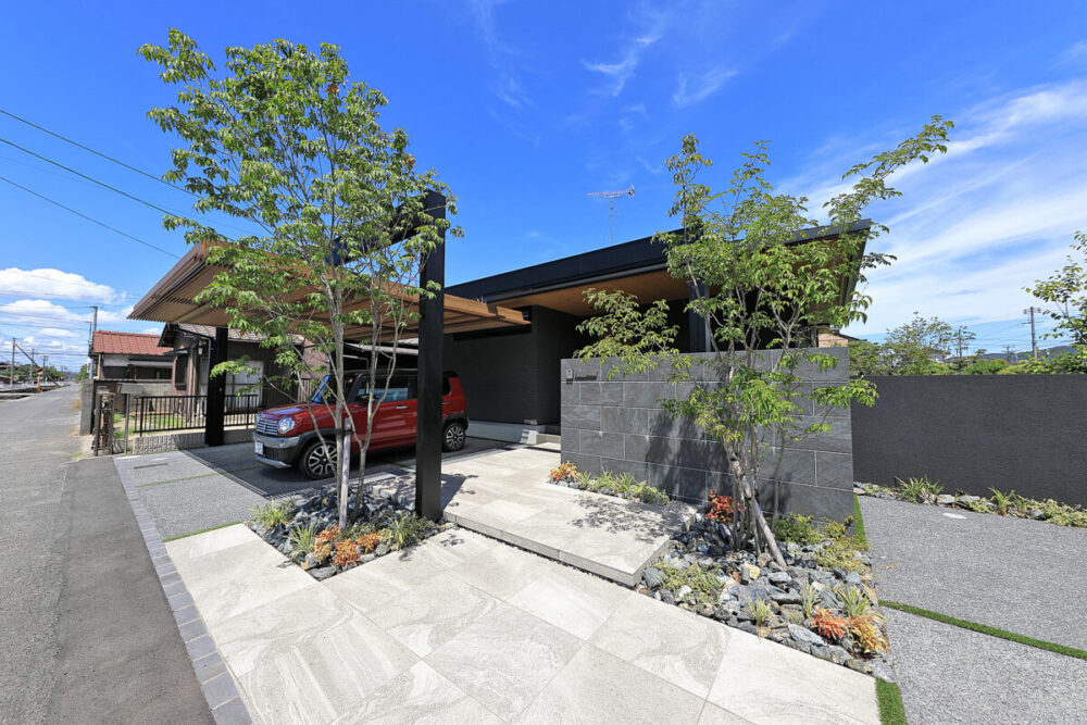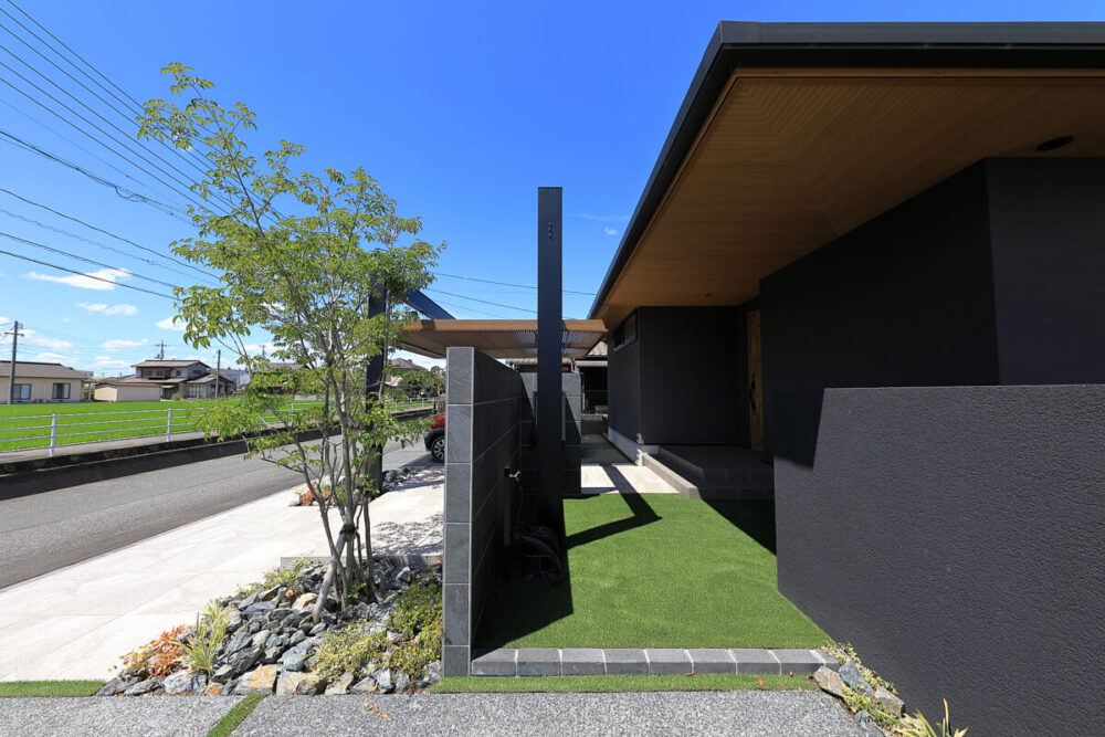 建物の重厚感と深みに合わせ、ブラックを基調とした外壁に、タイルと塗り壁を組み合わせデザインいたしました。設計の際、玄関を開けると通行人や散歩中の方から室内が見えてしまう状況だったため、植栽を活用して視線を遮り、フレームを利用して空間を有効に使いガレージを広く確保。お庭で遊ぶお子様が直接道路に出ないよう、そしてプライバシーを守る目的でタイル門壁を設けています。お庭側の壁は外壁と調和するよう塗り壁で仕上げ、質感の違いによって門壁を際立たせました。大型の宅配ポストはL字に設置し、正面から目隠し。動線も意識した配置としています。植栽により黒を基調とした空間に柔らかさと季節感をプラス。建物全体が美しく引き立つ、暮らしに寄り添うお庭となりました。
