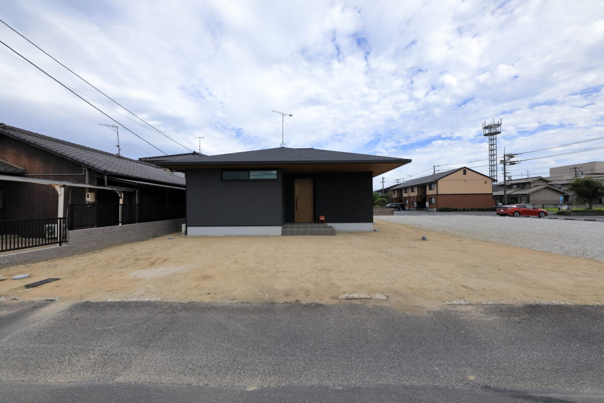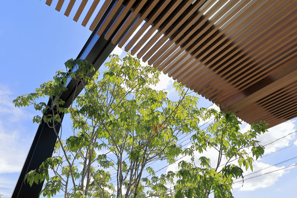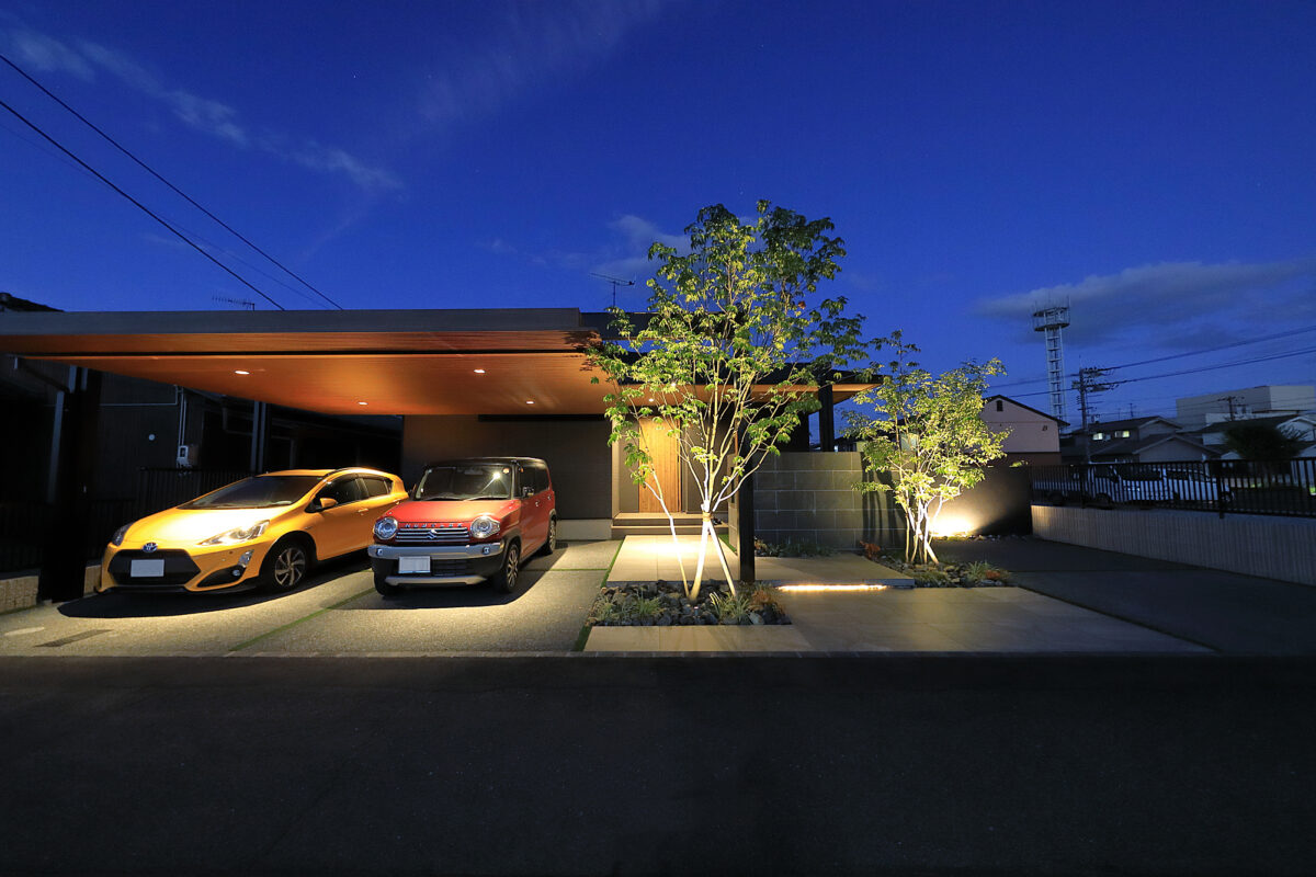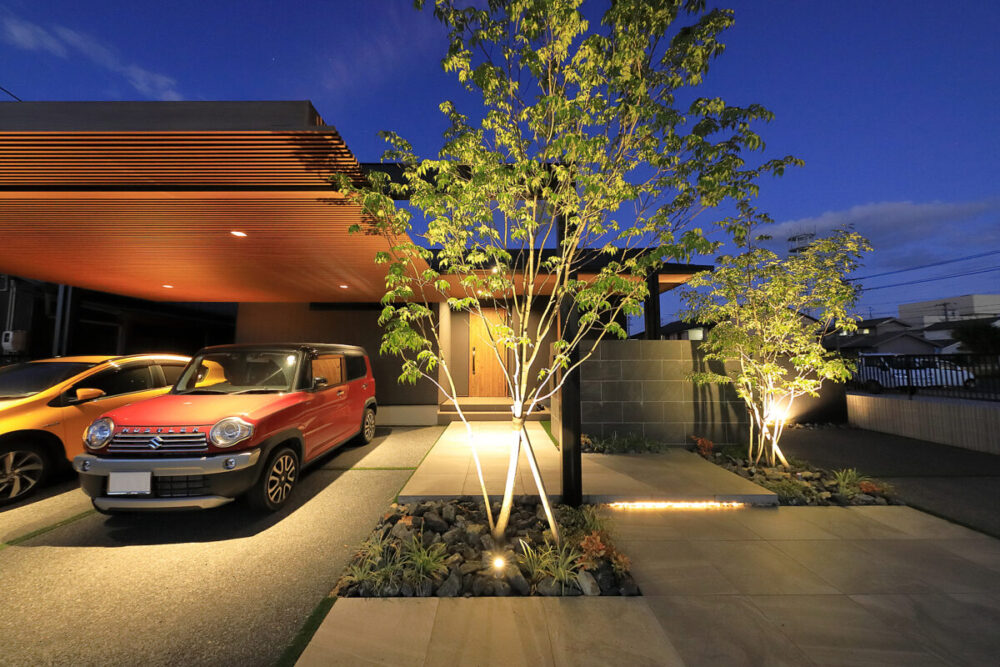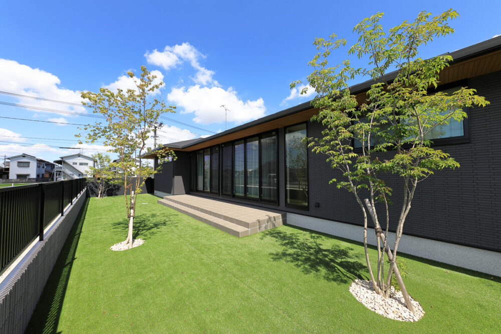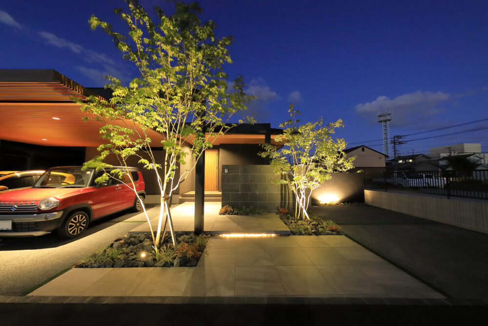 建物の重厚感と深みに合わせ、ブラックを基調とした外壁に、タイルと塗り壁を組み合わせデザインいたしました。設計の際、玄関を開けると通行人や散歩中の方から室内が見えてしまう状況だったため、植栽を活用して視線を遮り、フレームを利用して空間を有効に使いガレージを広く確保。お庭で遊ぶお子様が直接道路に出ないよう、そしてプライバシーを守る目的でタイル門壁を設けています。お庭側の壁は外壁と調和するよう塗り壁で仕上げ、質感の違いによって門壁を際立たせました。大型の宅配ポストはL字に設置し、正面から目隠し。動線も意識した配置としています。植栽により黒を基調とした空間に柔らかさと季節感をプラス。建物全体が美しく引き立つ、暮らしに寄り添うお庭となりました。