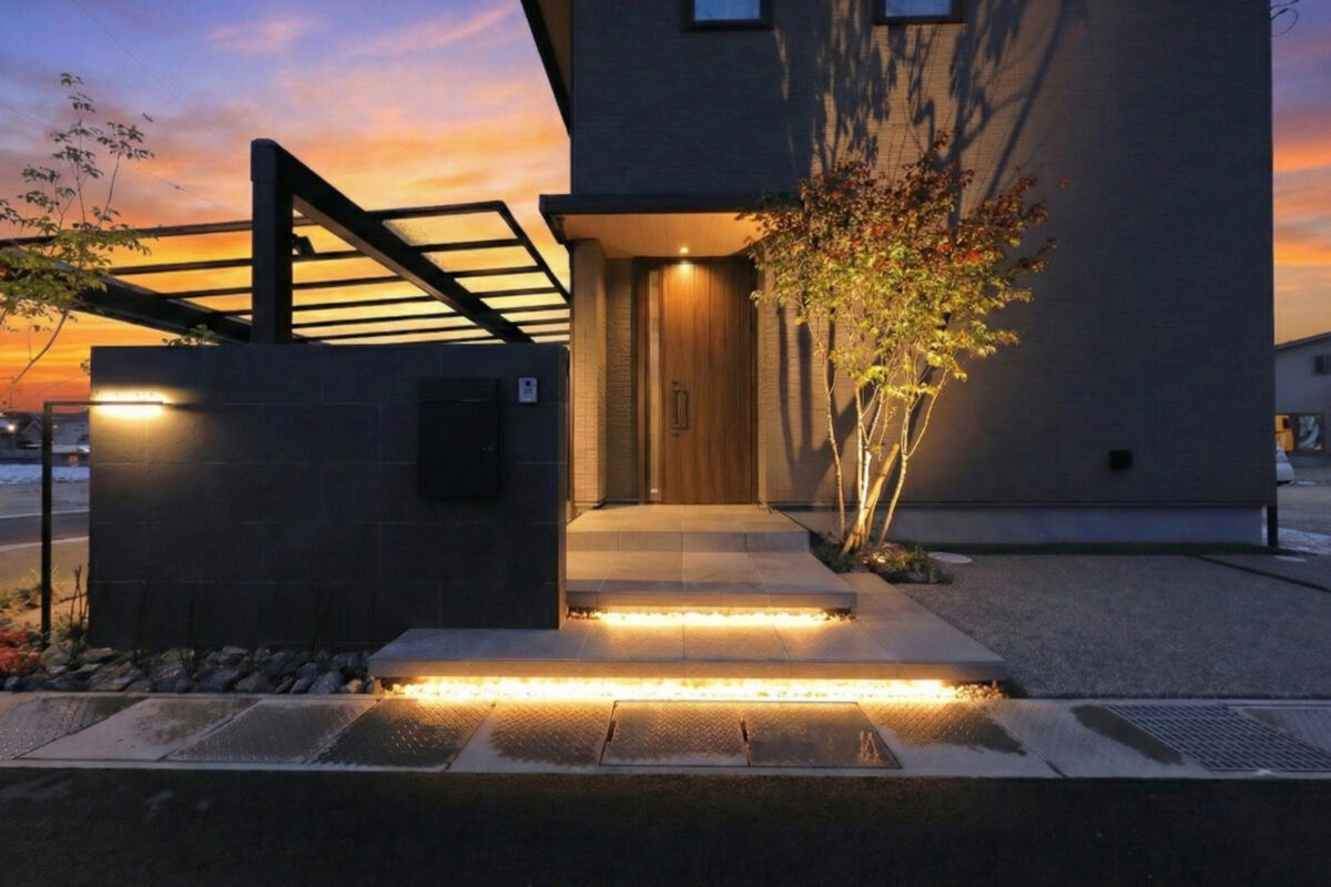 道路との高低差を活かし、45cm幅の大判タイルで構成したゆとりある3段のアプローチ階段をデザインしました。手前2段を蹴込み仕様にすることで、まるで階段が浮いているような洗練された印象を与えます。タイルの質感を生かした門袖には、空間を引き締めるL字フレームの表札を配置。取り付け位置は、団地道路からの視線と帰宅時の動線を計算して決定しました。シンボルツリーのヤマモミジは、ガレージへの視線を緩やかに遮るアイストップとして機能。昼は風に揺れる緑が、夜はライティングによる陰影が、住まい手の帰りを温かく迎えます。