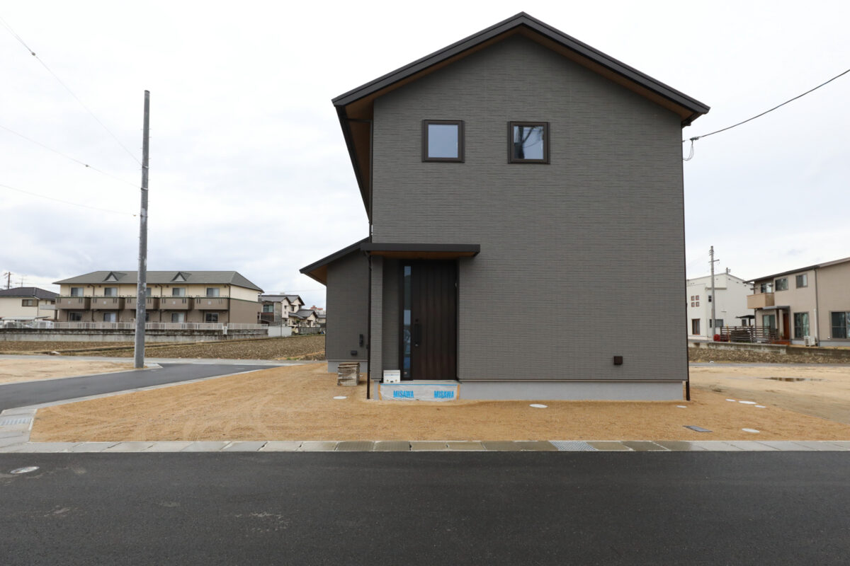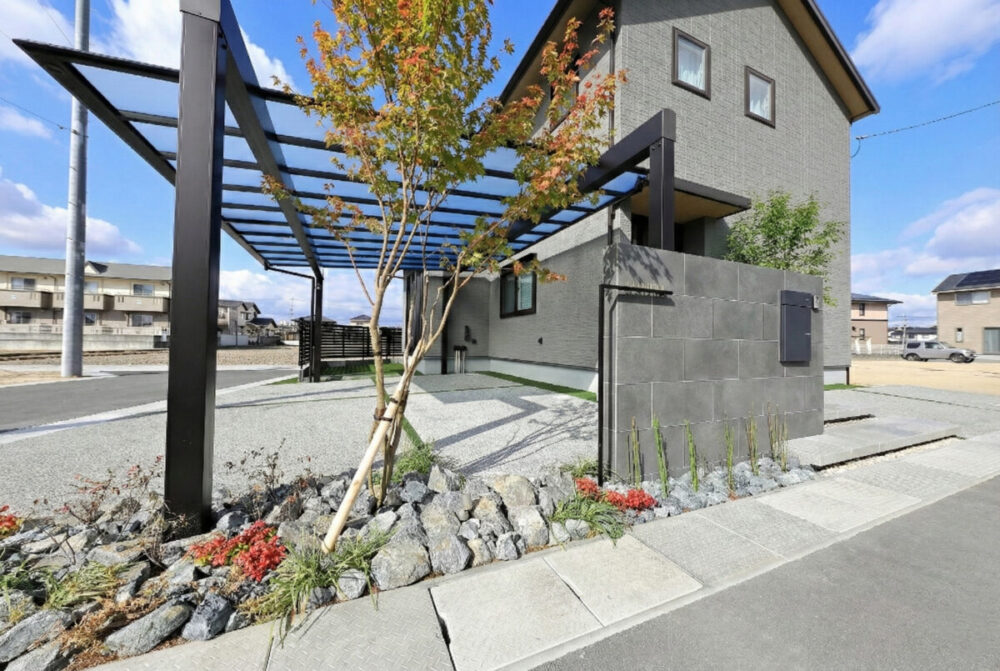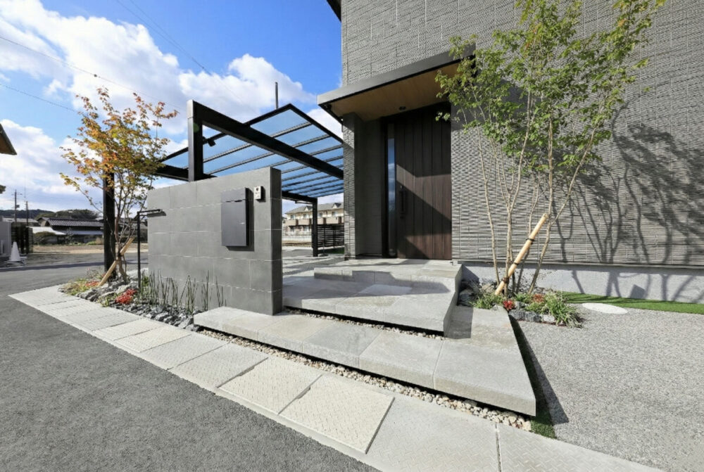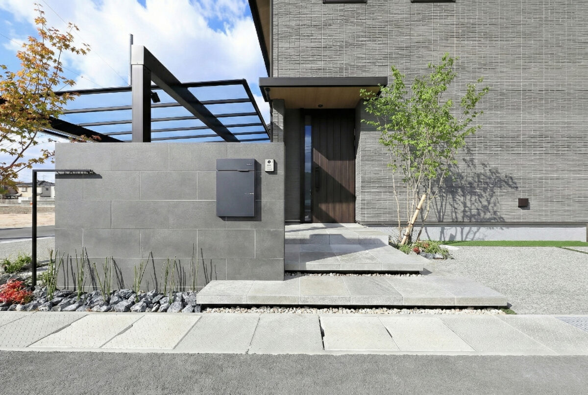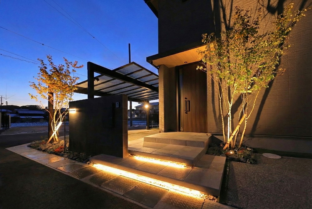 道路との高低差を活かし、45cm幅の大判タイルで構成したゆとりある3段のアプローチ階段をデザインしました。手前2段を蹴込み仕様にすることで、まるで階段が浮いているような洗練された印象を与えます。タイルの質感を生かした門袖には、空間を引き締めるL字フレームの表札を配置。取り付け位置は、団地道路からの視線と帰宅時の動線を計算して決定しました。シンボルツリーのヤマモミジは、ガレージへの視線を緩やかに遮るアイストップとして機能。昼は風に揺れる緑が、夜はライティングによる陰影が、住まい手の帰りを温かく迎えます。