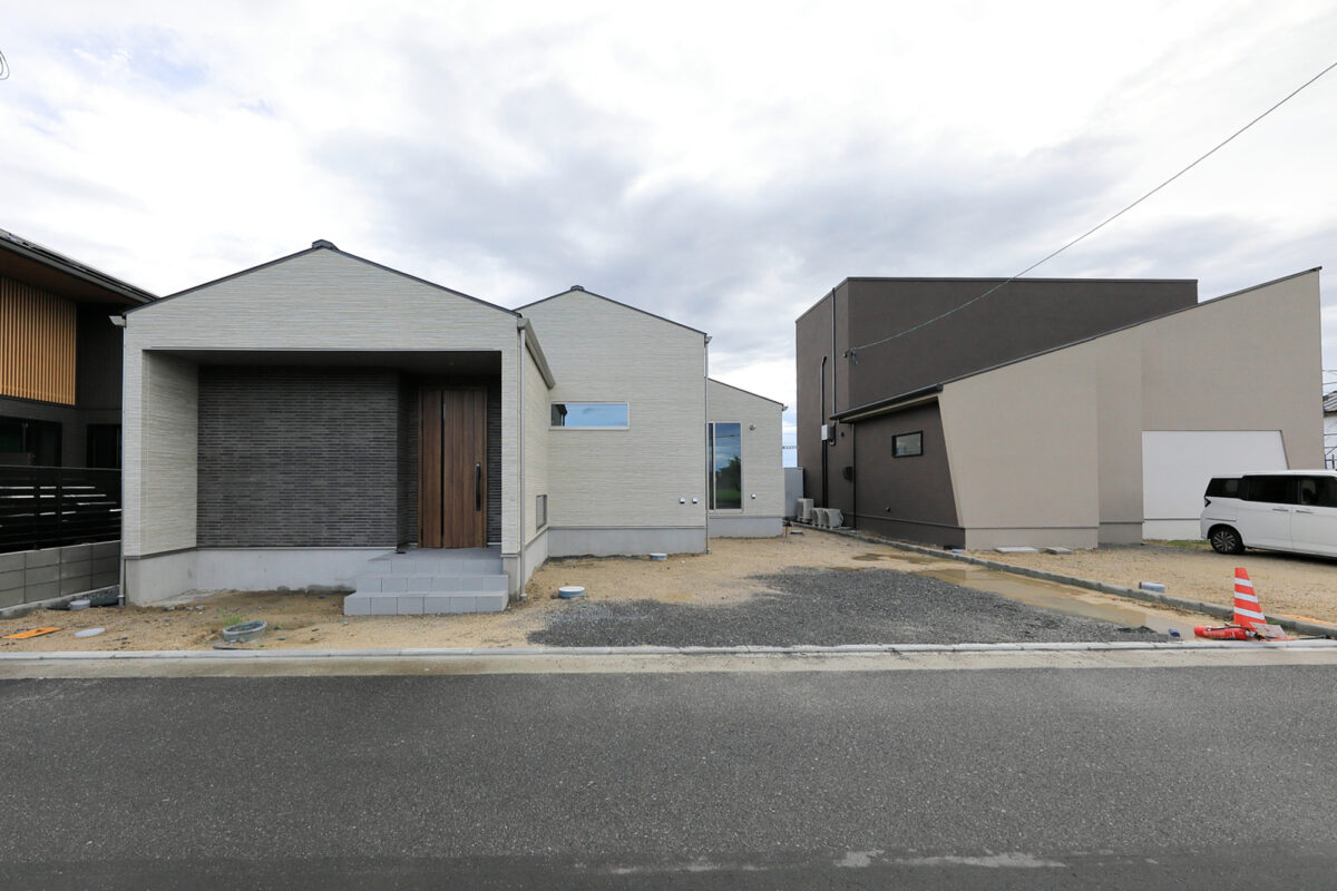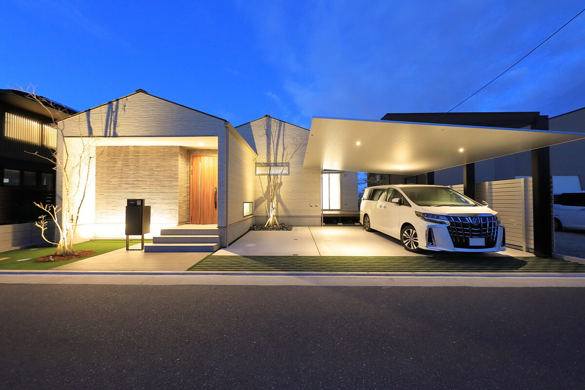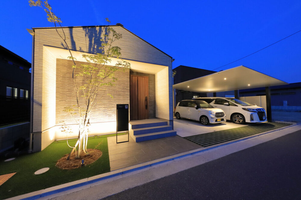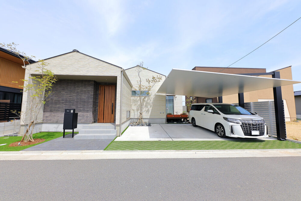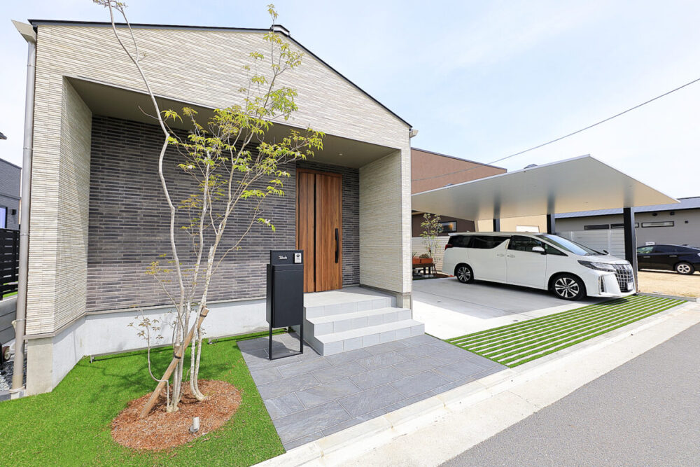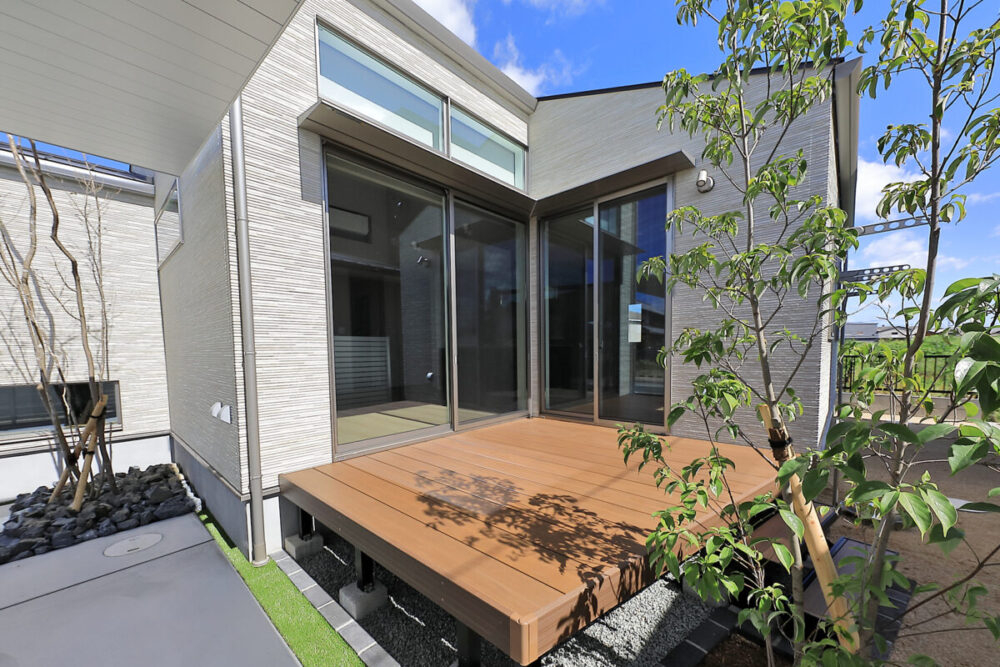 建物の外壁タイルが引き立つよう、手前に植栽を植え込み、シンプルな機能門柱を配置。片側支柱のカーポートでは、空間を広く見せるとともに建物のデザインの美しさを邪魔することがありません。窓前にはシンボルツリーの植栽を植え、リビング前のデッキは敢えて斜め形状にし、庭空間を出来るだけ広くとれるように植栽配置も含めてデザイン。隣地とのプライバシーにはアルミ材で板塀を制作し、スタイリッシュに。